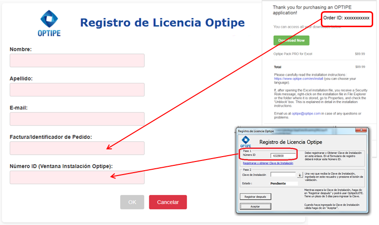 - Complete los datos: su ID de complemento (Paso 1) y número de factura/pedido.