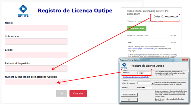 - Insira o Número da Fatura/ID do pedido e o Número de ID Optipe (Passo 1).